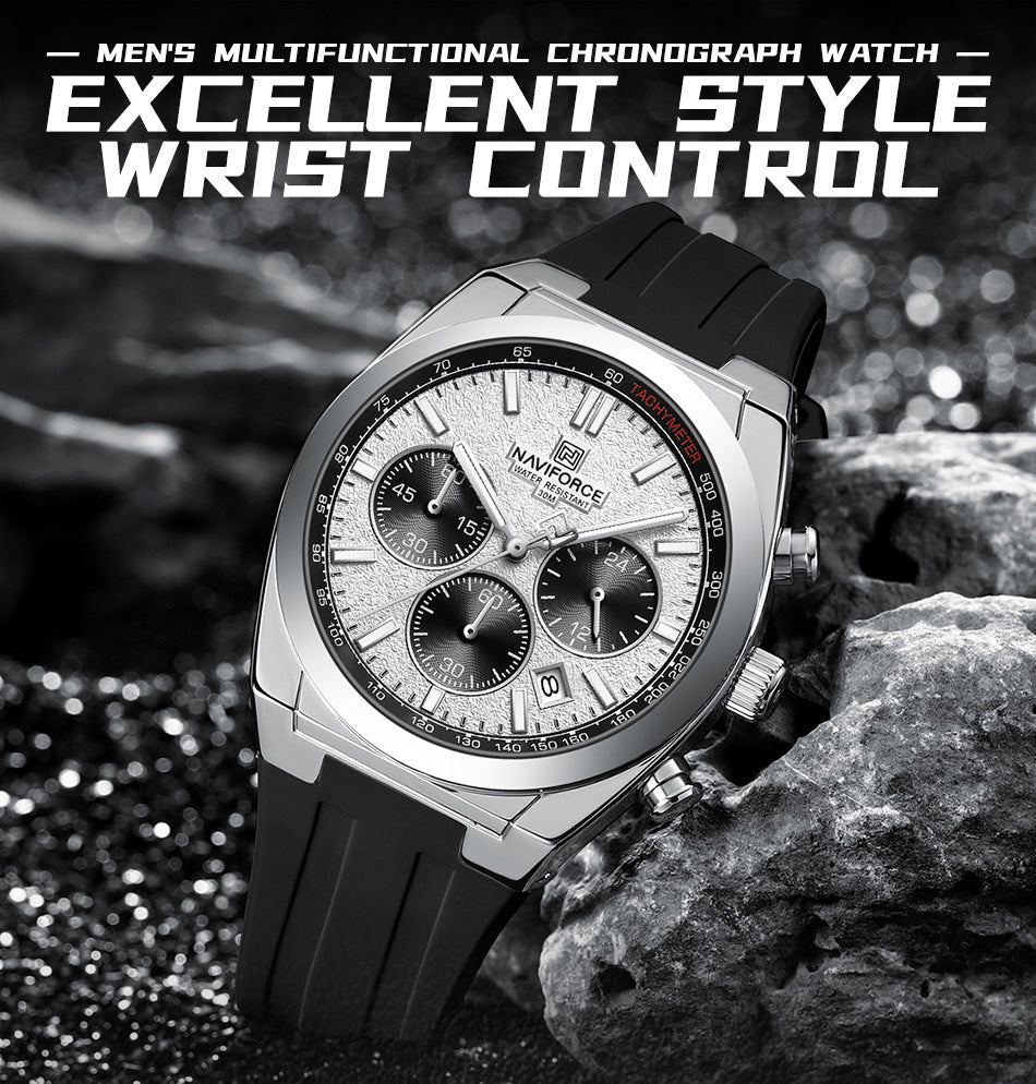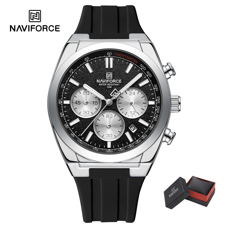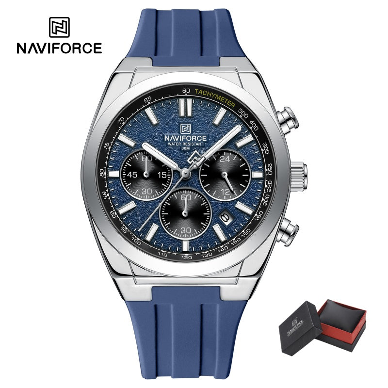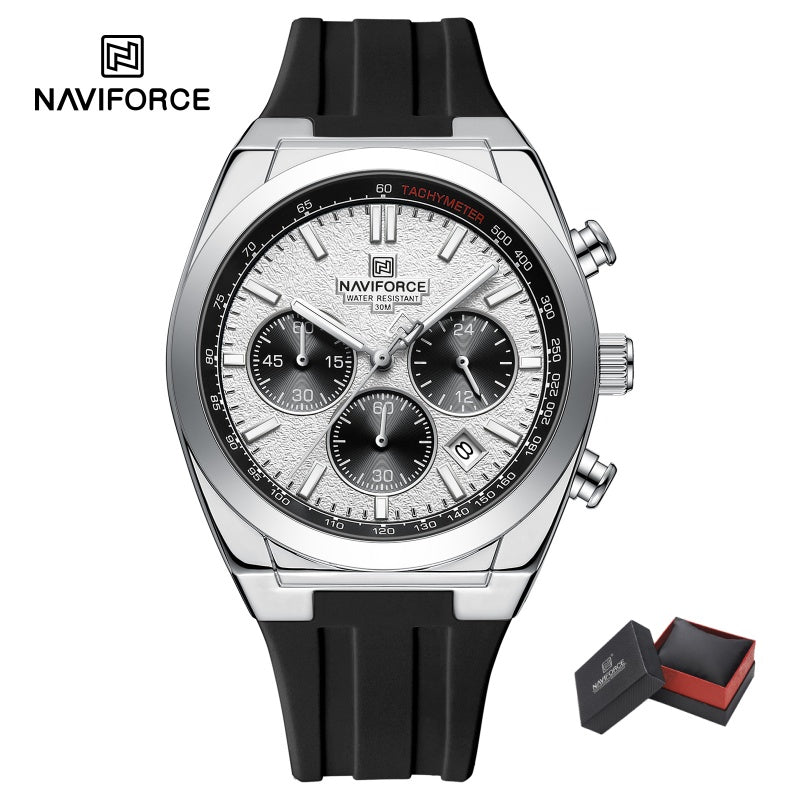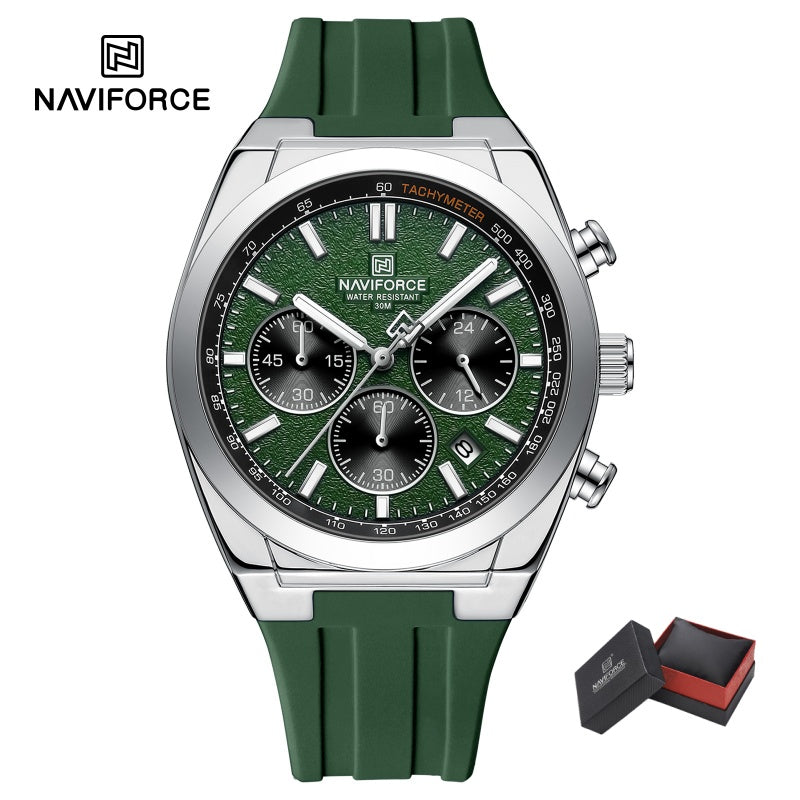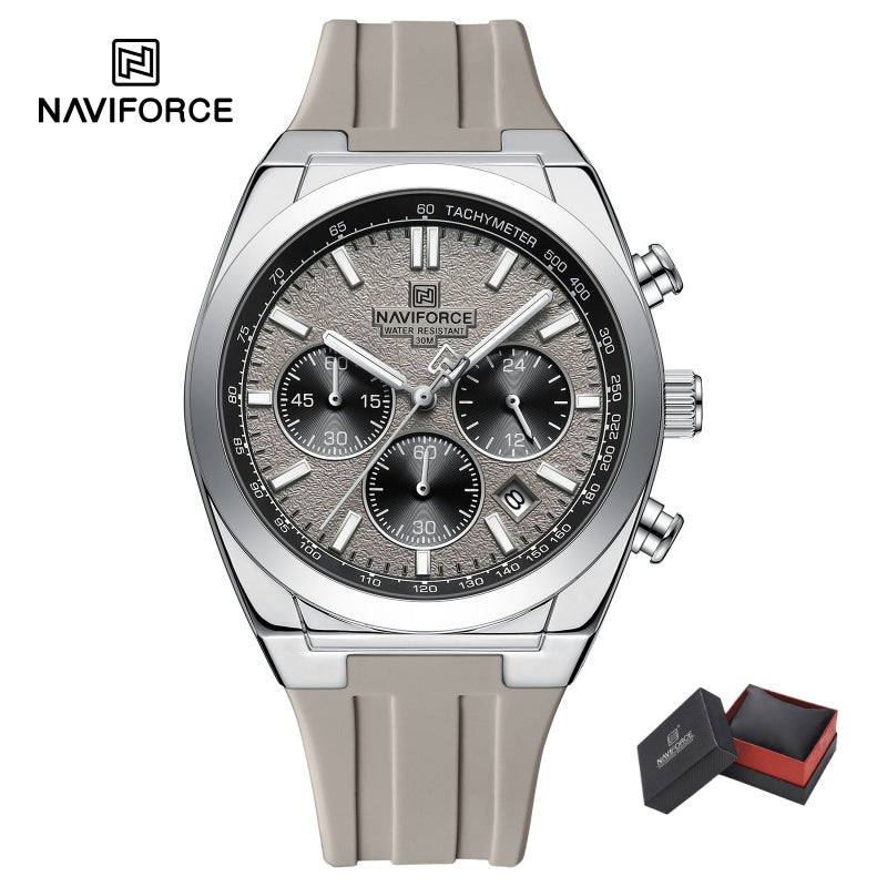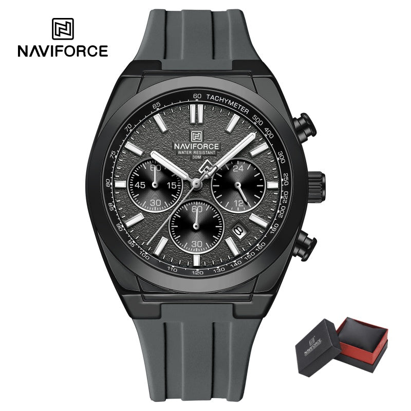 Elevate your style with the NAVIFORCE NF8080 Quartz Chronograph WatchThis original NAVIFORCE quartz chronograph watch stands out with its modern and sporty appearance. The textured dial paired with sub-dials creates a strong visual contrast that immediately catches attention, adding a clean and solid look. The matching silicone strap brings an energetic and comfortable style to the watch. The tachymeter bezel further enhances its dynamic character. Overall, this watch achieves a perfect balance of style, personality, and everyday practicality, making it an ideal choice for those who appreciate confident and contemporary wristwatches.