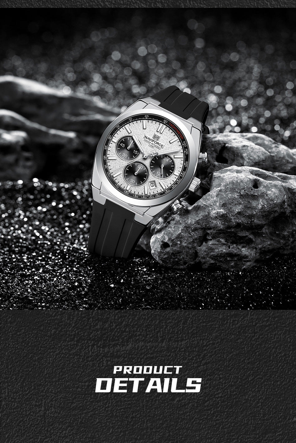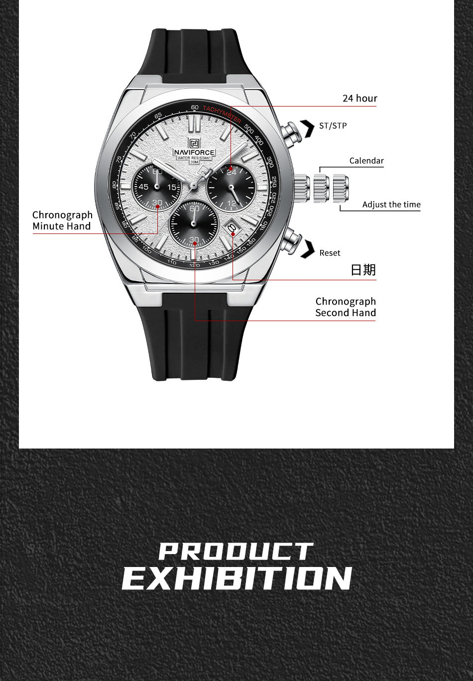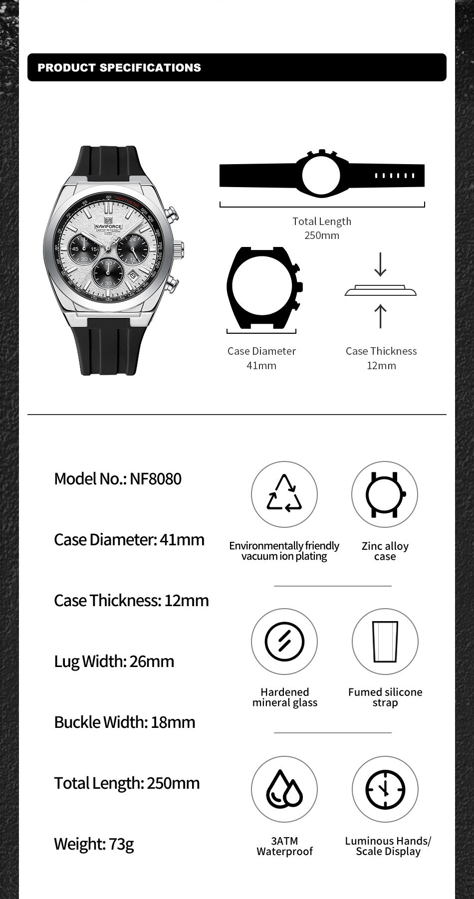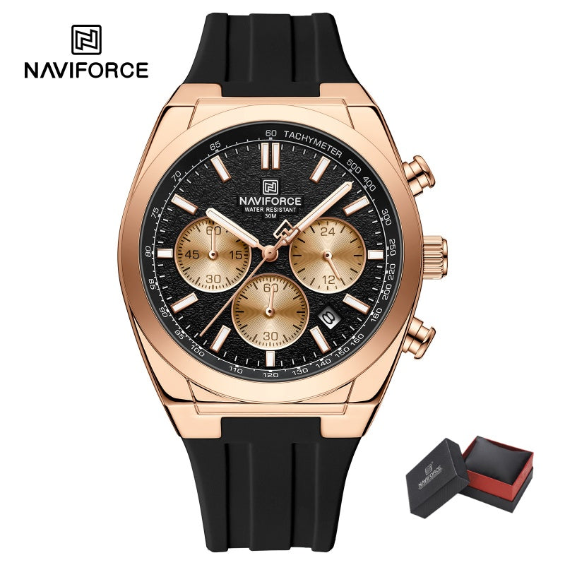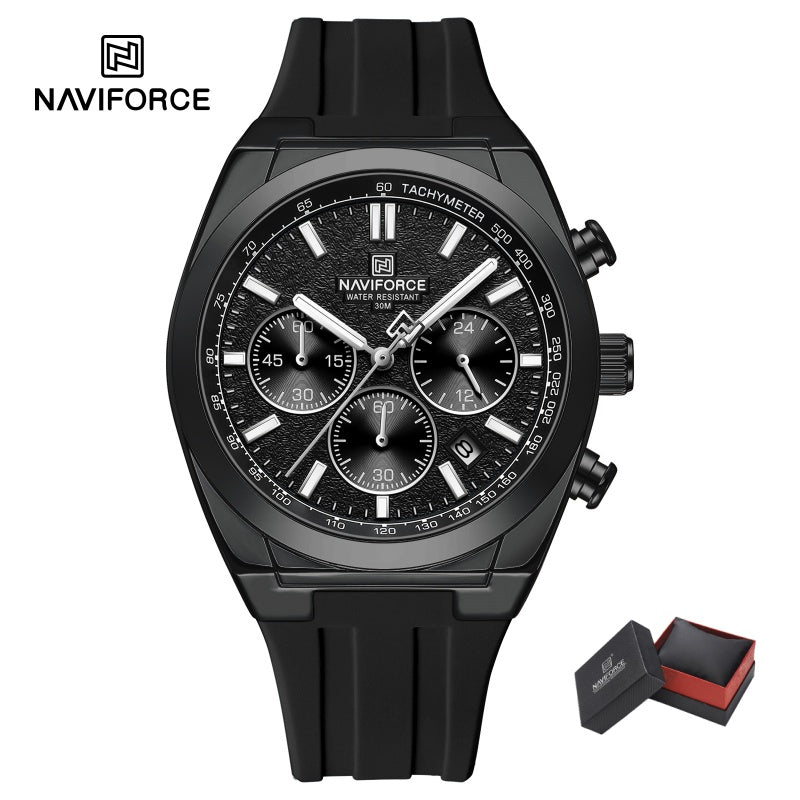 Elevate your style with the NAVIFORCE NF8080 Quartz Chronograph WatchThis original NAVIFORCE quartz chronograph watch stands out with its modern and sporty appearance. The textured dial paired with sub-dials creates a strong visual contrast that immediately catches attention, adding a clean and solid look. The matching silicone strap brings an energetic and comfortable style to the watch. The tachymeter bezel further enhances its dynamic character. Overall, this watch achieves a perfect balance of style, personality, and everyday practicality, making it an ideal choice for those who appreciate confident and contemporary wristwatches.