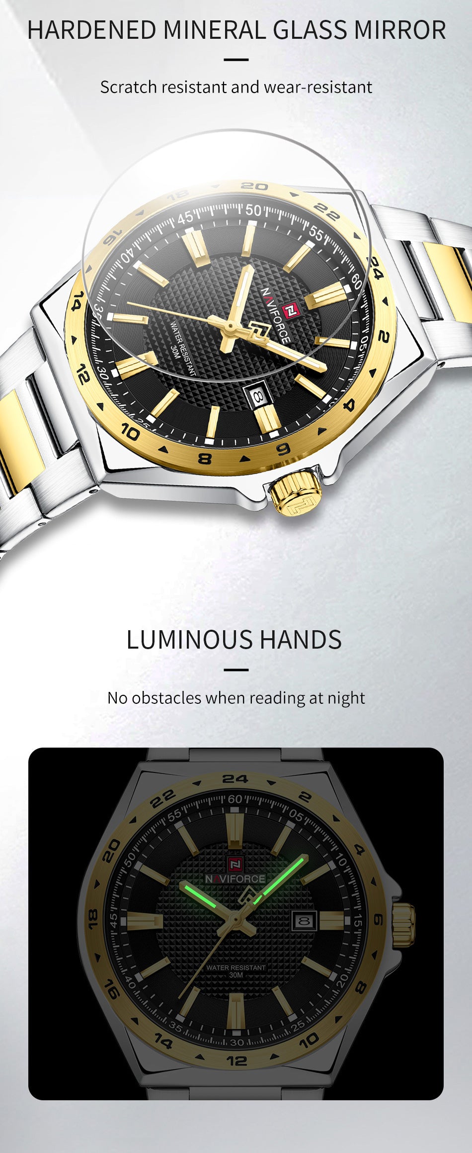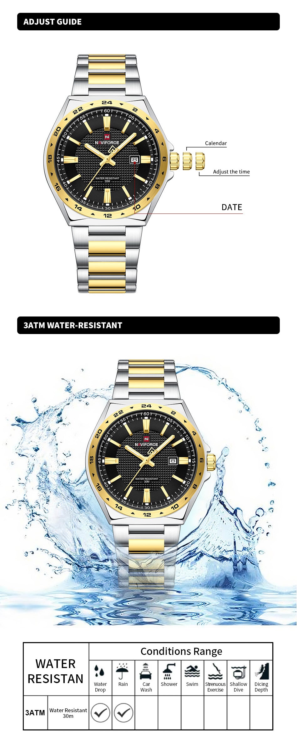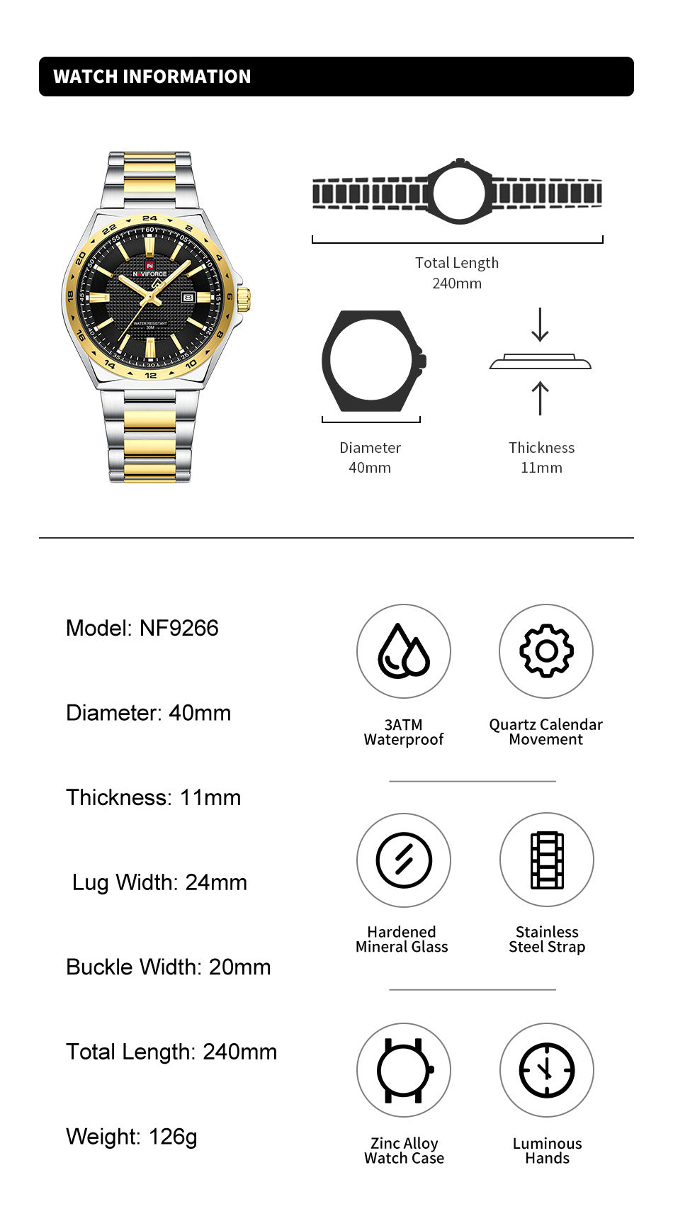 · 3ATM Water Resistance: Water-resistant up to 30 meters, the NF9266 is perfect for everyday use and can handle splashes and brief immersion in water.